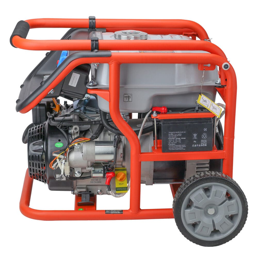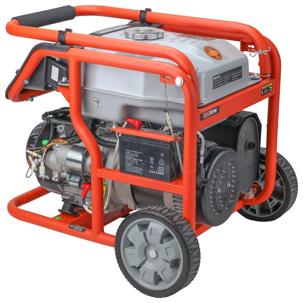 Электрогенератор EVOline KB 5000 E – бензиновый однофазный (1 фазный) генератор с максимальной мощностью 4,5 кВА. Силовым агрегатом данной модели является четырехтактный двигатель ZONGSHEN ZS 182 F. Рама выполнена из высококачественной стали, которая служит не только для защиты двигателя, но и для удобной транспортировки электростанции. Объем топливного бака составляет 32 литра, что дает примерно 14 часов непрерывной работы в зависимости от нагрузки. Уровень шума при работе генератора составляет 74,5 дБ. Данная модель идеально подходит как для дома, так и для малого бизнеса. Оснащена транспортировочным комплектом с колесами, счетчиком мото-часов и 2-мя розетками, имеет размер (590 х 440 х 500 мм) и вес (60 кг). Отличие от модели KB 5000 в том, что в данной модели установлен электрический стартер для более комфортного и простого запуска. Гарантия составляет 2 года.