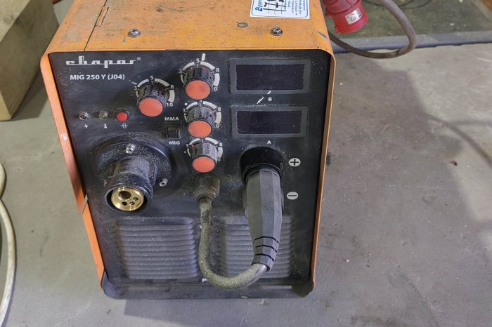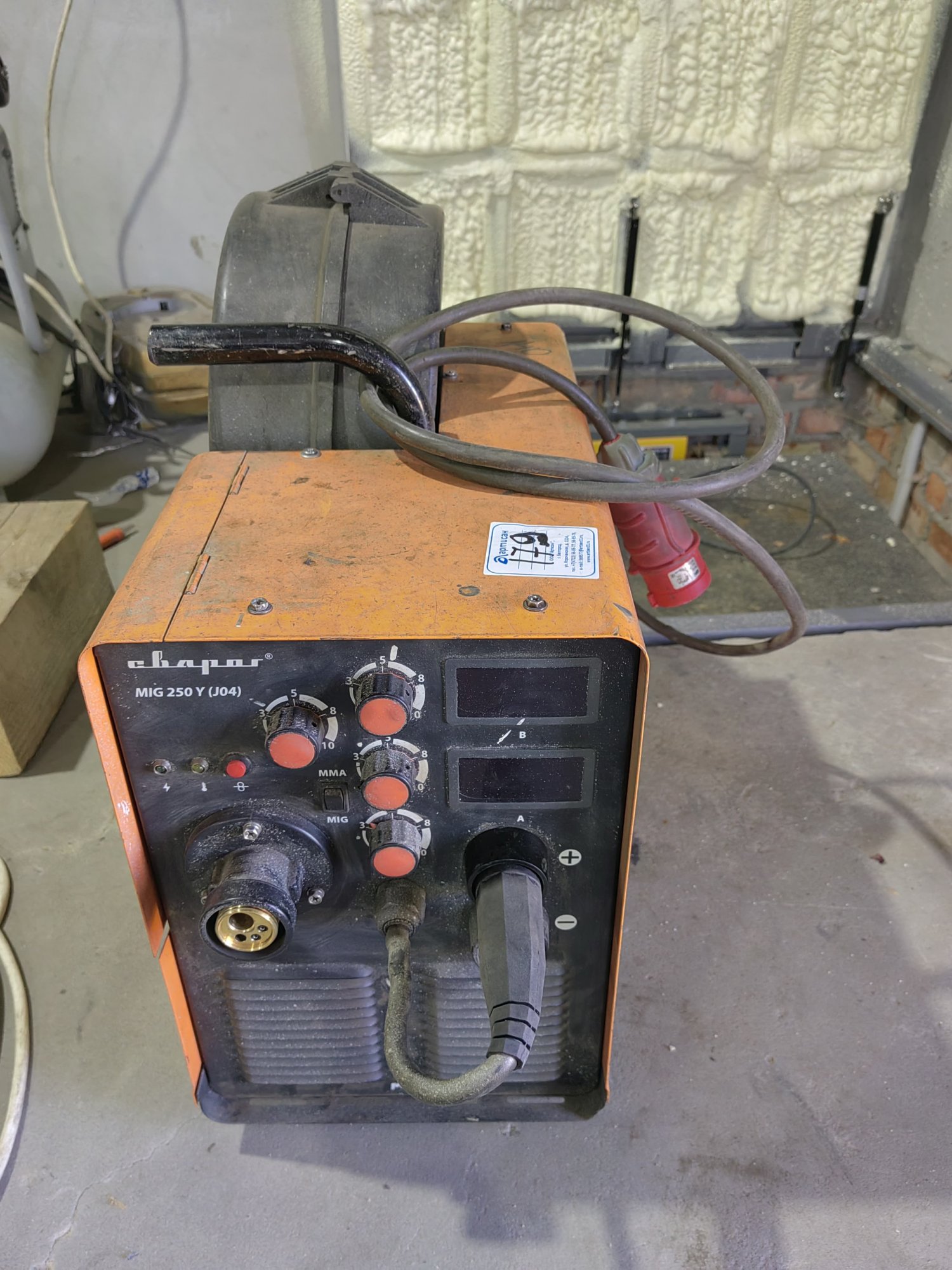 Замена ролика подачи проволоки, замена вилки и розетки под сварочный кабель, чистка от пыли.